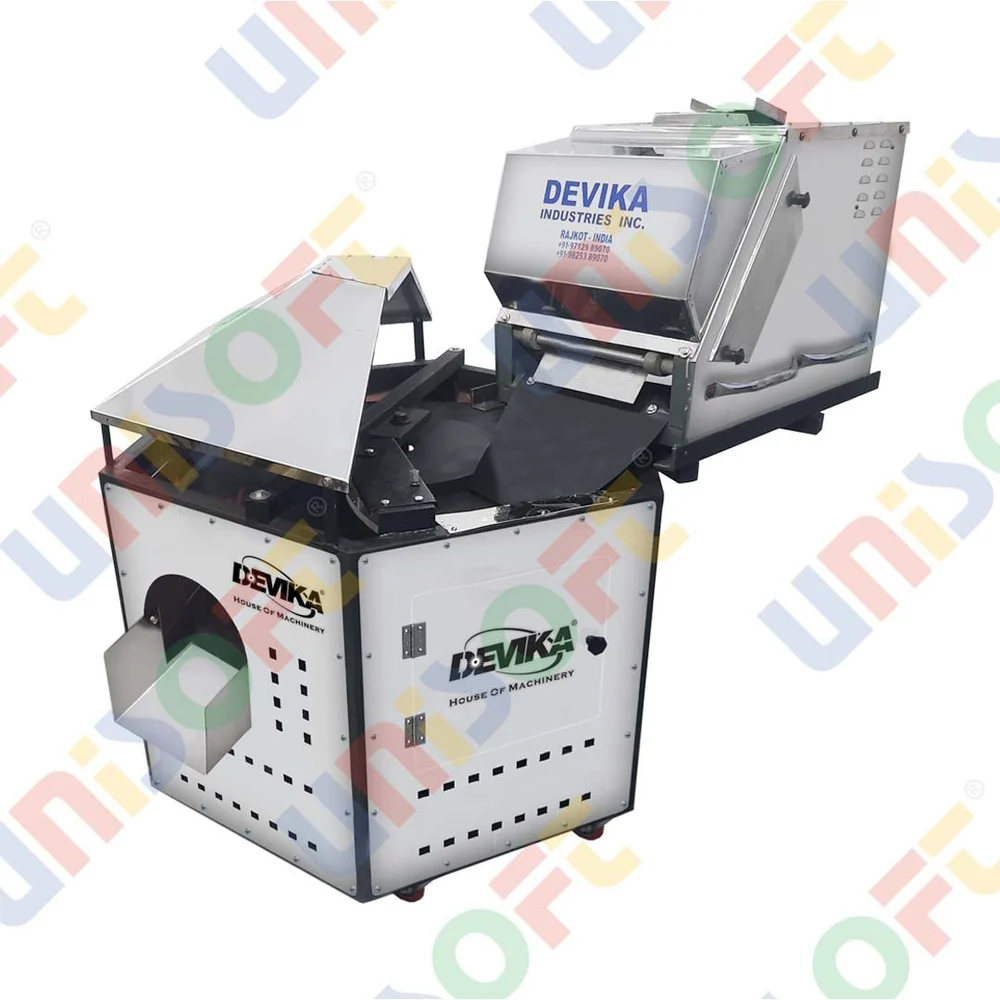 Chapati pressing machien with rotary roasting unit comes togather with the high effiecieant and smooth work with the making or roti/ chapati process.  per hr 800-900 pcs output, new technollogy implement for moothe and userfreindly working.  2 unit /hr power and 1. 5 kg lpg consumption, best for catereres, bhojanshala, mesh, canteen owner, hospital where daily consumption and continue consumption is requires.  main advantage is both are saperate machine but use to gather and if need to use only one unit then also can use it.