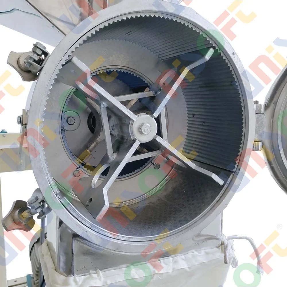 Double chamber in aluminum 8×4 and 12×6 size, ss cutter ss bitter, 5 hp 410v crompton motor with motor starter panel, 3600 rpm , 6 screen, collection vessel, cleaning brush, cotton bag, ms base frame structure, hopper 15 kg at a time, 45-60 kg /hr griding capacity, 80 kg weight